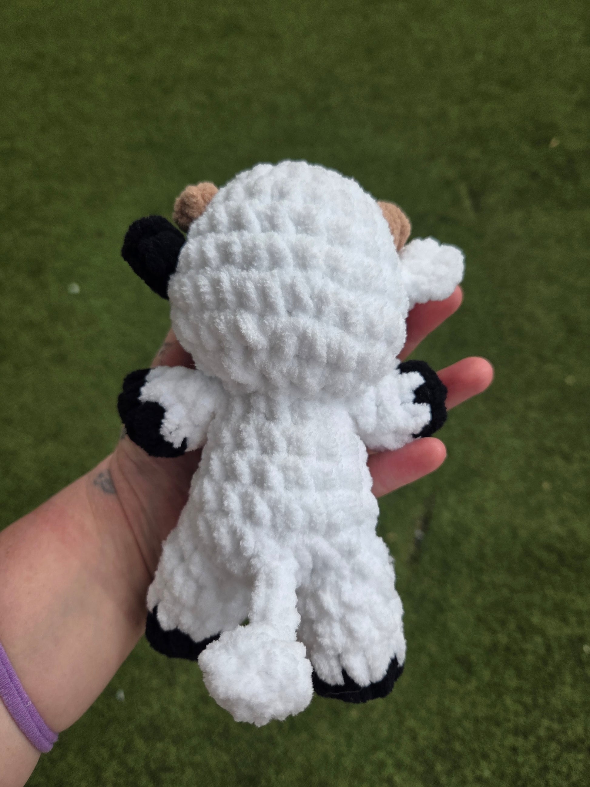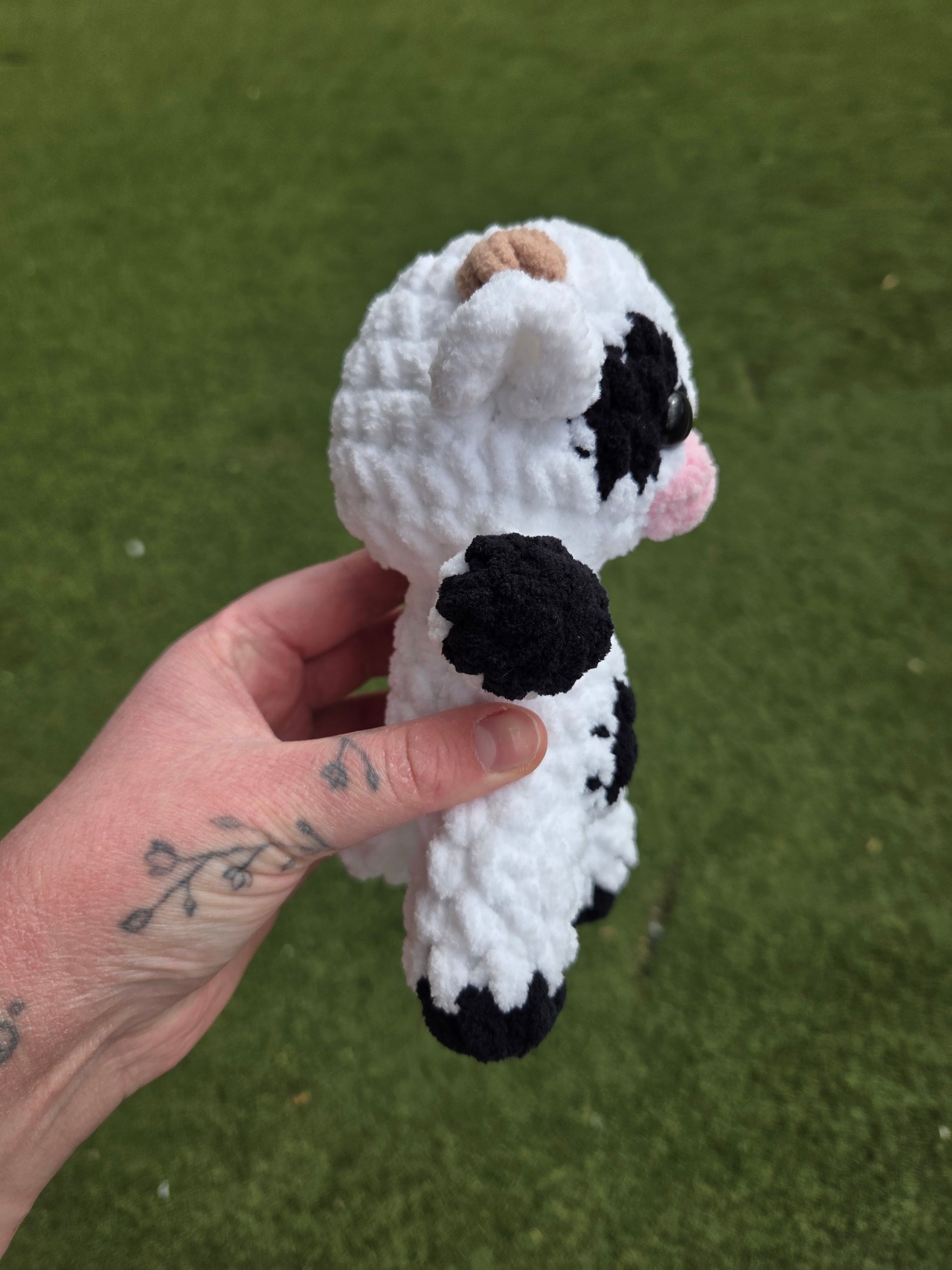 This adorable crochet cow is my own pattern, and is made with so much love! It's made from fluffy chenille yarn, which makes it super cuddly!